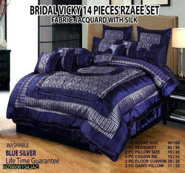 • Package Includes: 1 x King Size Bedsheet, 2 x Pillow Covers, 1x Vicky Razai Light Filled with Polyester, 6 x Small Cushions, 2 Floor Cushion, 2 Gawo Pillow
