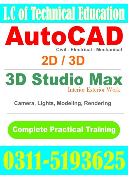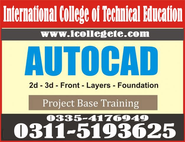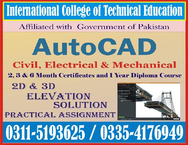 Autocad civil course in Rawalpindi,Autocad civil course in Rawalpindi,Autocad civil is best course in Rawalpindi, Islamabad, Lahore.International college of technical education is best institute for that course.admission open for boys and girls,for more detail o3115193625.The AutoCAD® Civil 3D® 2019: Fundamentals learning guide is designed for Civil Engineers and Surveyors who want to take advantage of the AutoCAD® Civil 3D® software’s interactive, dynamic design functionality. The AutoCAD Civil 3D software permits the rapid development of alternatives through its model-based design tools. You will learn techniques enabling you to organize project data, work with points, create and analyze surfaces, model road corridors, create parcel layouts, perform grading and volume calculation tasks, and layout pipe networks.This course introduces the core concepts of project design using Autodesk Civil 3D. Civil 3D software is utilized in many Engineering firms to design projects of all sizes and budgets. Civil Engineers, Land Surveyors, Landscape Architects, Structural Engineers, Traffic Engineers, and others can benefit from the tools and dynamic design capabilities of this software, allowing project teams to work collaboratively across disciplines to successfully complete their projects.In this course, students will learn the skills required to work with the primary design components in Civil 3D to complete typical project tasks. This includes survey tools, surfaces, grading, corridors and pipe networks. Students will complete tasks typically required on a Civil Engineering project. The goal of this course is to provide students with the basic knowledge they need to immediately work in the Civil 3D software.The course is presented through video tutorials and multimedia content within the Moodle virtual platform, with exercises like tests and practical cases, along with live webinars.Learn the basic concepts, tools, and functions of AutoDesk Civil 3D. If you are new to Civil 3D, then this course is for you.What to expect from this course:After completion of this course, you are expected to be able to perform the basic calculations using civil 3D software. This course target the beginners. It’s a great way to start with basics and then move to more advanced courses.The Power of Civil 3D:In the past, engineers used to perform earth work calculations manually; this usually takes a lot of time and effort in addition to the human’s errors expected. Using Civil 3D, such calculations can be performed easily withing minutes. In addition, Civil 3D produces printable and neat reports that can be presented to key people in your company. What are exactly the points covered in this course: