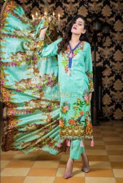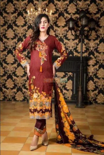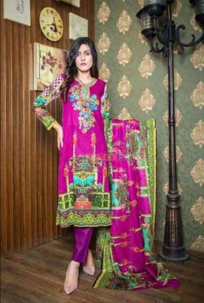 Three Piece Embroidered Lawn -Embroidered Shirt 3 Meter -Printed Dupatta (Net/Chiffon Varies With Design) 2.5 Meter -Dyed Trouser 2.5 Meter