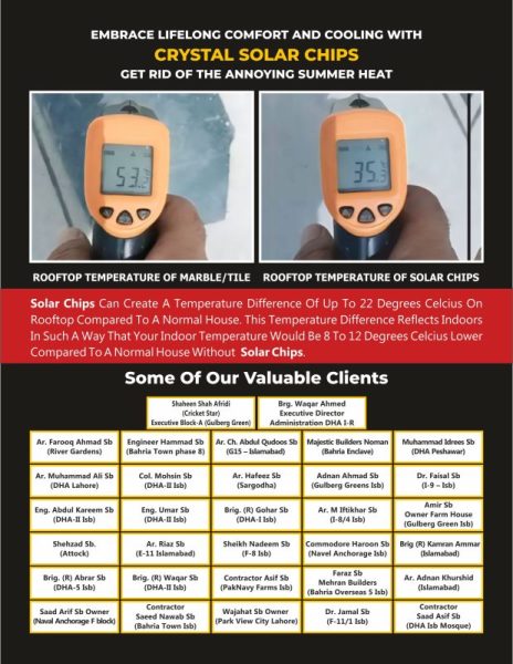Stay cool and save energy with our 100% heat and water-proof Crystal Solar Chips. Crystal Solar Chips are an innovative rooftop insulation and finishing material designed to reflect heat, prevent water leakage, and enhance your building’s energy efficiency. Applied on the roof floor, they create a durable, glossy surface that keeps interiors cooler while reducing electricity costs — the perfect blend of protection, performance, and style for your rooftop. Contact us on 03160507387 for more details.
