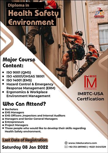Diploma in Health Safety Environment is a 48 Hours Training Program with USA Certification. This “Diploma in Health Safety & Environment” training will enable the participants to undertake effective auditing and implementation of Occupational Health & Safety Management, Environmental and Safety Methods.