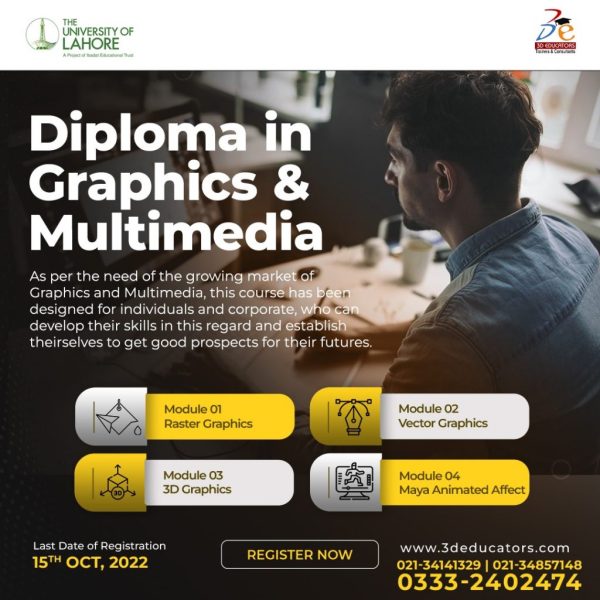 Diploma of Graphics & Multimedia has consisted of four major modules, where the basic of Graphics and advanced techniques shall be incorporated. Further, the in Graphics Modules the Print Media Graphics and Electronics Media Graphics is being Covered and latest tools of Multimedia which ADOBE CS6 is being taught. Each module of Graphics and Multimedia training in Karachi and Pakistan is taught by the professionals, who may have extensive experience and exposure in the same field.