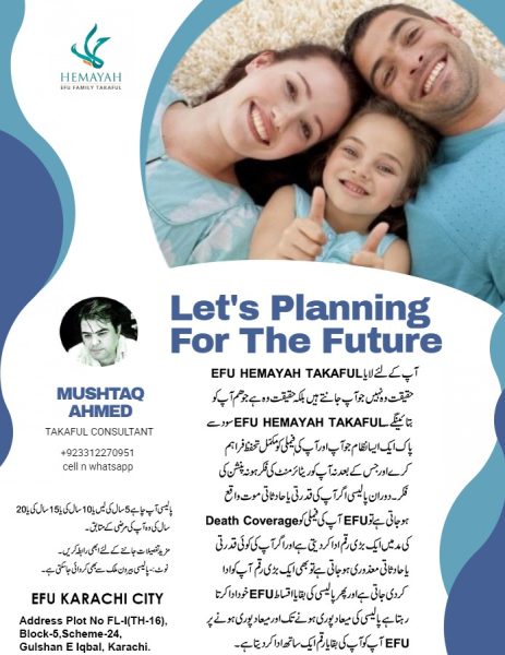 Salam.Ap k lye laya EFU HEMAYAH TAKAFUL profit system. Haqeeqat woh nhi jo ap jantey hein Haqeeqat woh ha jo hum apko btayengy EFU HEMAYAH TAKAFUL Sood se Pak eik aisa nizaam jo ap aur ap ki Family ko Mukammal Tahaffuz faraham karey aur jis k bad na apko retirement ki fikar ho aur na pension ki fikar.policy k dauran agar apki natural death hojati ha tu apki family ko EFU Takaful eik bari amount pay karta ha aur agar ap ki koi mazoori hojati ha policy k dauran tu phir apko koi installment deny ki zaroorat nhi aur eik bari amount ap ko de dijati ha aur apki baqaya policy khud EFU Takaful installments pay karta rehta ha aur policy mature hony per apko policy ki baqaya raqam de di jati ha.policy chahey 5 saal ki lein ya 10 saal ki lein ya 15 saal ki lein ya 20 saal ki woh apki marzi ha.