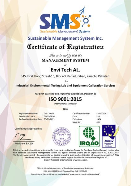 Envi Tech AL, was assessed for the Management System of ISO-9001:2015 for the scope of “Industrial, Environmental testing lab and equipment calibration services”, by auditing team of Sustainable Management System Inc. and qualifies for both Certificates. Certification Date: 4-01-2020.