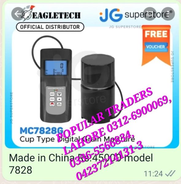 Grain moisture meters of all brands like DICKY JOHN, Farmex, Farmcomp, Agratronix, Draminski, Delmhorst, Unimeter, Kett, OGA, Smartsensor, Gann and models like MiniGac, MT16, MTpro, MTpro+, Wile55, GmmMini, C2000, F2000, M3G, M20G, TA5, Kett 506, Kett 206, LDS-1G, 7821, HP8032, MC7821G, 7822, 7825, 7828, AR991 all are available at Popular Traders Lahore