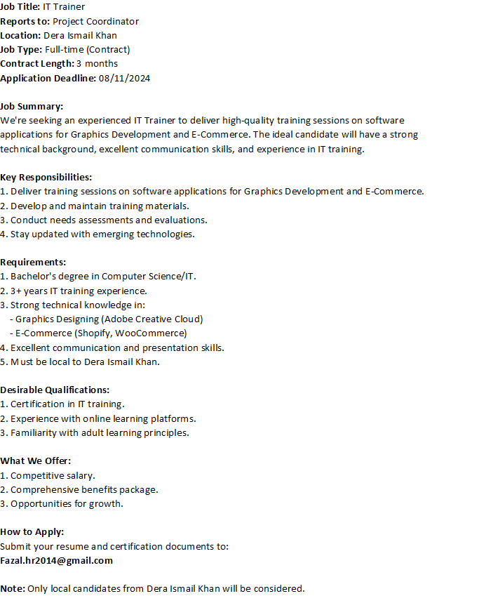We’re seeking an experienced IT Trainer to deliver high-quality training sessions on software applications for Graphics Development and E-Commerce. The ideal candidate will have a strong technical background, excellent communication skills, and experience in IT training.