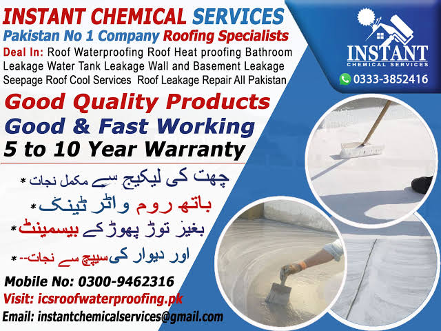 Instant Chemical Services Company providing Services Is Reputable Water proofing And Roof Heat Proofing Roof Insulation Company Working Since 2010. The Structural Repairing Instant Chemical Services Is Also Specialist in Residential Roof Waterproofing Services. Roof Heat Proofing Solution. Bathroom Leakage Treatment. Water Tank Seepage Control Wall Sealant Chemical And Cool Solutions. Expansion Joint Leaking Waterproofing Expert. Swimming Pool Leak Proofing. Warehouse Waterproofing Leakage Container Roofing Contractor Protect To All Roof RCC Precast Slab Metal Absolute Roofing throughout the Pakistan. Instant Chemical Services is Providing services in Karachi DHA Defence Clifton Tariq Road Site Area North Nazimabad Korangi tando adam Badin Dadu Port Qasim malir Cantt Shersha larkana Hyderabad Islamabad Lahore All Over In Pakistan, hub chowki Balochistan khuzdar