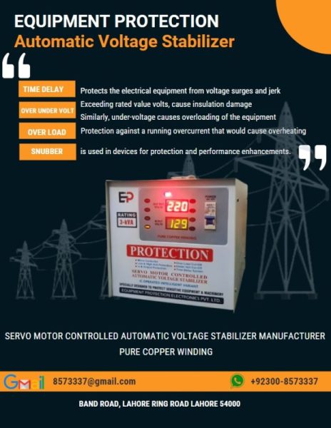 We manufacture a Programable Multi-Function Servo Motor Controlled IC operated Protection Based Electronic Device that not only regulates the voltage, supplied to your electrical equipment and ensures a stable voltage within acceptable limits, and also protects from over and under volt problems by cutting off the circuit out-put supply, and protecting from over current, jerks & surge, it also carries time delay feature, a snubber, over load cut off feature, Fan cooling, Thermostat sensor, Error beep, They are essential for protecting expensive electronic devices such as computers operated devices, sensitive and intelligent devices, televisions, refrigerators, air conditioners, Solar inverters, Med Lab equipment and other industrial & household appliances.