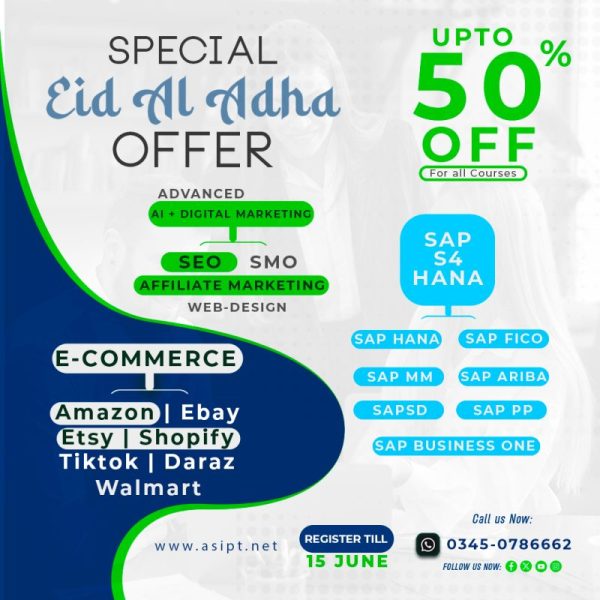 Ready to supercharge your career? Special Eid-ul-Adha-2024 Offer 50%OFF, Unlock new opportunities with our comprehensive training programs in E-commerce with amazon, eBAY, etsy, walmart, tiktok, shopify, daraz, Digital Marketing, SEO and SAP ERP S4Hana Fico-SCM-MM-SD-PP-HCM-Ariba-Business-One!