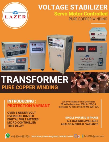 SERVO MOTOR controlled, Automatic Voltage Stabilizers & Regulators. (pure copper) Since 1986